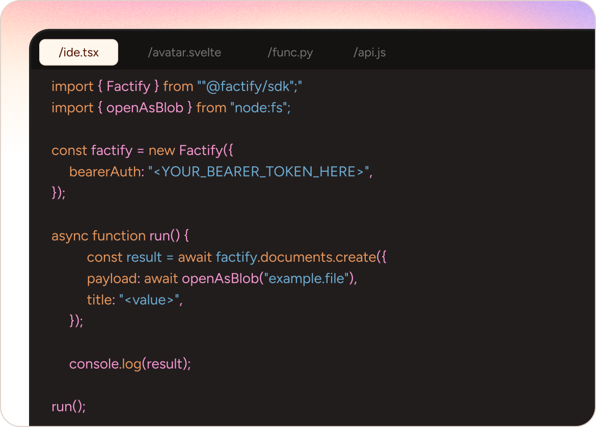 Factify provides an API to build intelligent documents that collect data, enforce access, and stay auditable.